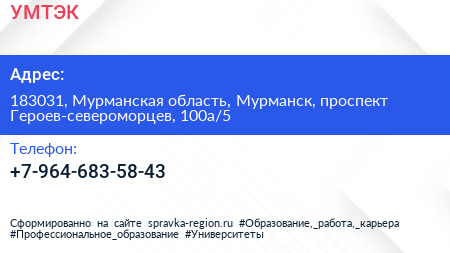 УМТЭК по адресу 183031, Мурманская область, Мурманск, проспект Героев-североморцев, 100а/5 в дальнейшем Организация, размещена в следующих категориях: