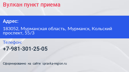Вулкан, пункт приема по адресу 183052, Мурманская область, Мурманск, Кольский проспект, 55/3 в дальнейшем Организация, размещена в следующих категориях: