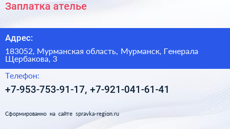 Заплатка, ателье по адресу 183052, Мурманская область, Мурманск, Генерала Щербакова, 3 в дальнейшем Организация, размещена в следующих категориях: