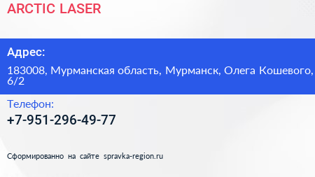 ARCTIC LASER по адресу 183008, Мурманская область, Мурманск, Олега Кошевого, 6/2 в дальнейшем Организация, размещена в следующих категориях: