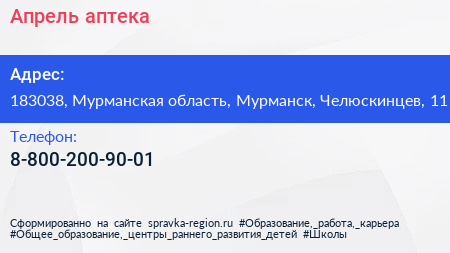 Апрель, аптека по адресу 183038, Мурманская область, Мурманск, Челюскинцев, 11 в дальнейшем Организация, размещена в следующих категориях: