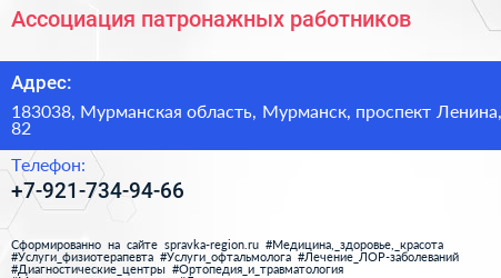 Ассоциация патронажных работников по адресу 183038, Мурманская область, Мурманск, проспект Ленина, 82 в дальнейшем Организация, размещена в следующих категориях: