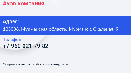 Avon, компания по адресу 183036, Мурманская область, Мурманск, Скальная, 9 в дальнейшем Организация, размещена в следующих категориях: