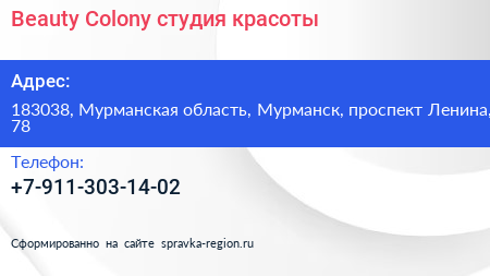 Beauty Colony, студия красоты по адресу 183038, Мурманская область, Мурманск, проспект Ленина, 78 в дальнейшем Организация, размещена в следующих категориях: