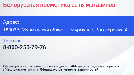 Белорусская косметика, сеть магазинов по адресу 183039, Мурманская область, Мурманск, Рогозерская, 4 в дальнейшем Организация, размещена в следующих категориях: