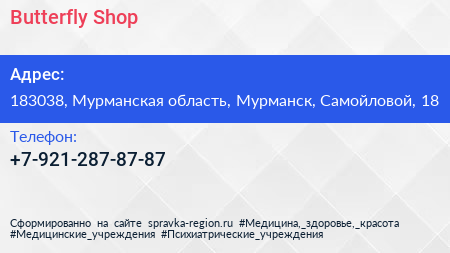 Butterfly Shop по адресу 183038, Мурманская область, Мурманск, Самойловой, 18 в дальнейшем Организация, размещена в следующих категориях: