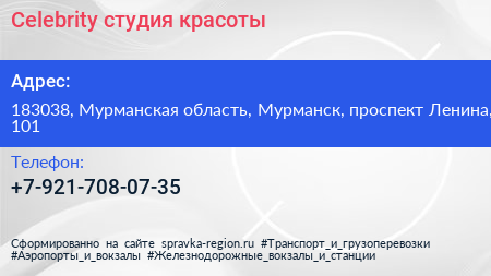 Celebrity, студия красоты по адресу 183038, Мурманская область, Мурманск, проспект Ленина, 101 в дальнейшем Организация, размещена в следующих категориях: