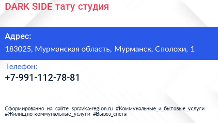 DARK SIDE, тату-студия по адресу 183025, Мурманская область, Мурманск, Сполохи, 1 в дальнейшем Организация, размещена в следующих категориях: