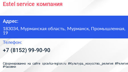 Estel service, компания по адресу 183034, Мурманская область, Мурманск, Промышленная, 19 в дальнейшем Организация, размещена в следующих категориях: