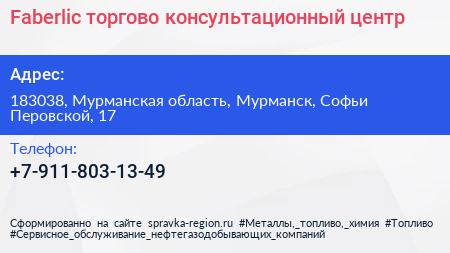 Faberlic, торгово-консультационный центр по адресу 183038, Мурманская область, Мурманск, Софьи Перовской, 17 в дальнейшем Организация, размещена в следующих категориях: