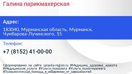 Галина, парикмахерская по адресу 183040, Мурманская область, Мурманск, Чумбарова-Лучинского, 15 в дальнейшем Организация, размещена в следующих категориях: