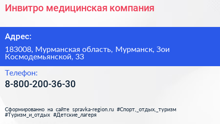 Инвитро, медицинская компания по адресу 183008, Мурманская область, Мурманск, Зои Космодемьянской, 33 в дальнейшем Организация, размещена в следующих категориях: