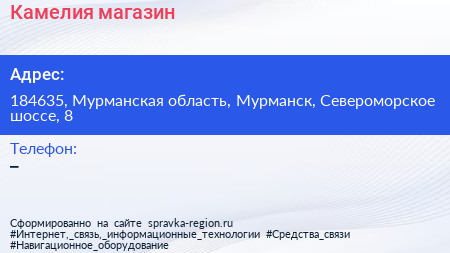 Камелия, магазин по адресу 184635, Мурманская область, Мурманск, Североморское шоссе, 8 в дальнейшем Организация, размещена в следующих категориях: