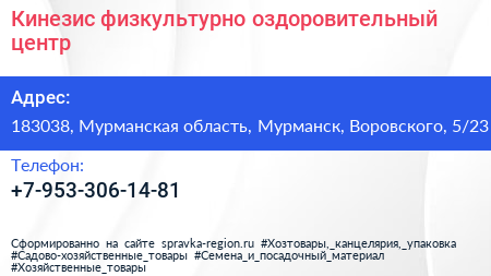 Кинезис, физкультурно-оздоровительный центр по адресу 183038, Мурманская область, Мурманск, Воровского, 5/23 в дальнейшем Организация, размещена в следующих категориях: