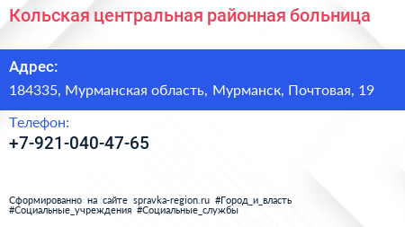 Кольская центральная районная больница по адресу 184335, Мурманская область, Мурманск, Почтовая, 19 в дальнейшем Организация, размещена в следующих категориях: