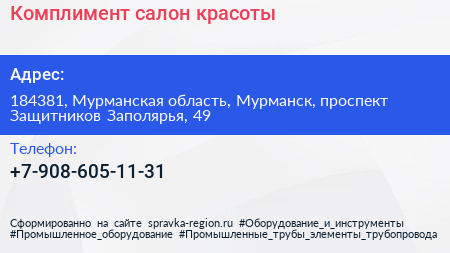 Комплимент, салон красоты по адресу 184381, Мурманская область, Мурманск, проспект Защитников Заполярья, 49 в дальнейшем Организация, размещена в следующих категориях: