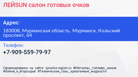 ЛЕЙSUN, салон готовых очков по адресу 183008, Мурманская область, Мурманск, Кольский проспект, 64 в дальнейшем Организация, размещена в следующих категориях: