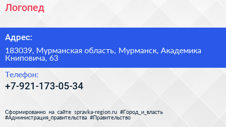 Логопед по адресу 183039, Мурманская область, Мурманск, Академика Книповича, 63 в дальнейшем Организация, размещена в следующих категориях: