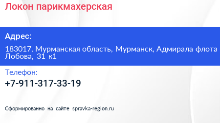 Локон, парикмахерская по адресу 183017, Мурманская область, Мурманск, Адмирала флота Лобова, 31 к1 в дальнейшем Организация, размещена в следующих категориях: