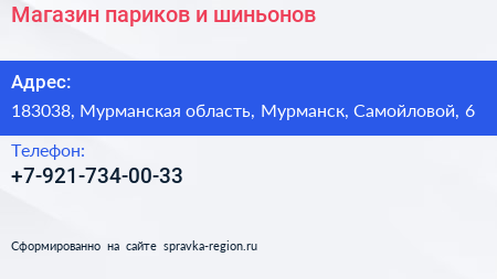 Магазин париков и шиньонов по адресу 183038, Мурманская область, Мурманск, Самойловой, 6 в дальнейшем Организация, размещена в следующих категориях: