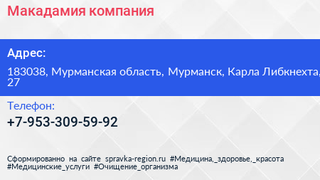 Макадамия, компания по адресу 183038, Мурманская область, Мурманск, Карла Либкнехта, 27 в дальнейшем Организация, размещена в следующих категориях: