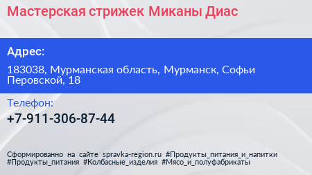 Мастерская стрижек Миканы Диас по адресу 183038, Мурманская область, Мурманск, Софьи Перовской, 18 в дальнейшем Организация, размещена в следующих категориях: