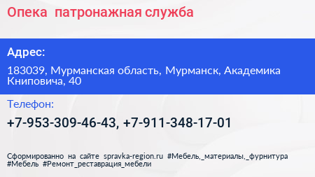 Опека+, патронажная служба по адресу 183039, Мурманская область, Мурманск, Академика Книповича, 40 в дальнейшем Организация, размещена в следующих категориях:
