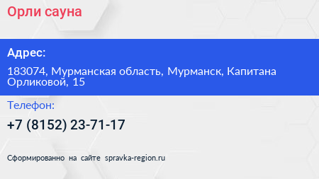 Орли, сауна по адресу 183074, Мурманская область, Мурманск, Капитана Орликовой, 15 в дальнейшем Организация, размещена в следующих категориях: