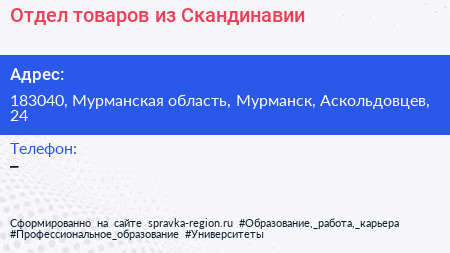 Отдел товаров из Скандинавии по адресу 183040, Мурманская область, Мурманск, Аскольдовцев, 24 в дальнейшем Организация, размещена в следующих категориях: