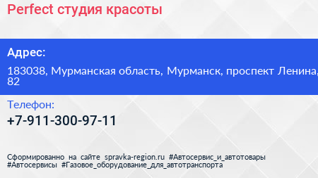 Perfect, студия красоты по адресу 183038, Мурманская область, Мурманск, проспект Ленина, 82 в дальнейшем Организация, размещена в следующих категориях: