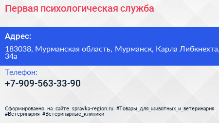 Первая психологическая служба по адресу 183038, Мурманская область, Мурманск, Карла Либкнехта, 34а в дальнейшем Организация, размещена в следующих категориях: