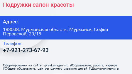 Подружки, салон красоты по адресу 183038, Мурманская область, Мурманск, Софьи Перовской, 23/19 в дальнейшем Организация, размещена в следующих категориях: