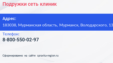 Подружки, сеть клиник по адресу 183038, Мурманская область, Мурманск, Володарского, 13 в дальнейшем Организация, размещена в следующих категориях: