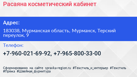 Расаяна, косметический кабинет по адресу 183038, Мурманская область, Мурманск, Терский переулок, 9 в дальнейшем Организация, размещена в следующих категориях: