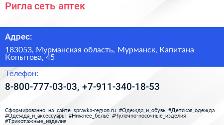 Ригла, сеть аптек по адресу 183053, Мурманская область, Мурманск, Капитана Копытова, 45 в дальнейшем Организация, размещена в следующих категориях: