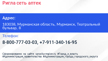 Ригла, сеть аптек по адресу 183038, Мурманская область, Мурманск, Театральный бульвар, 8 в дальнейшем Организация, размещена в следующих категориях: