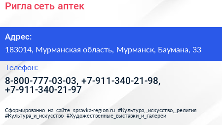 Ригла, сеть аптек по адресу 183014, Мурманская область, Мурманск, Баумана, 33 в дальнейшем Организация, размещена в следующих категориях: