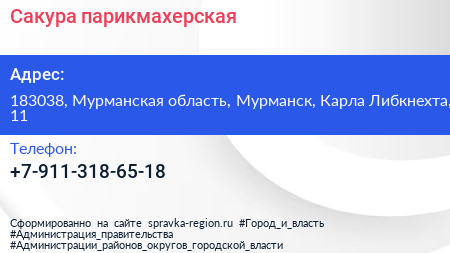 Сакура, парикмахерская по адресу 183038, Мурманская область, Мурманск, Карла Либкнехта, 11 в дальнейшем Организация, размещена в следующих категориях: