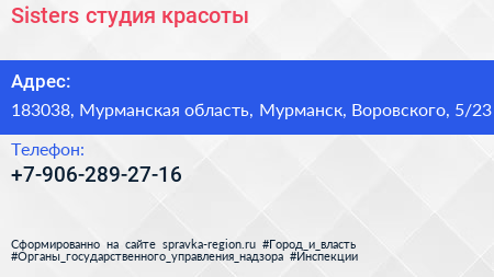 Sisters, студия красоты по адресу 183038, Мурманская область, Мурманск, Воровского, 5/23 в дальнейшем Организация, размещена в следующих категориях: