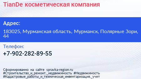 TianDe, косметическая компания по адресу 183025, Мурманская область, Мурманск, Полярные Зори, 44 в дальнейшем Организация, размещена в следующих категориях: