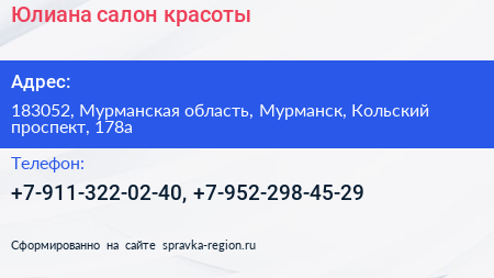Юлиана, салон красоты по адресу 183052, Мурманская область, Мурманск, Кольский проспект, 178а в дальнейшем Организация, размещена в следующих категориях: