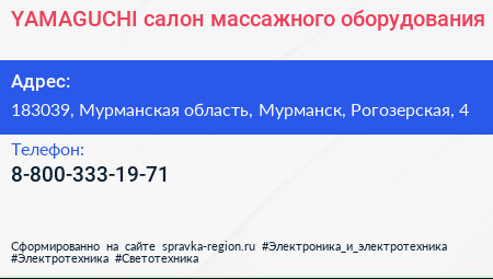 YAMAGUCHI, салон массажного оборудования по адресу 183039, Мурманская область, Мурманск, Рогозерская, 4 в дальнейшем Организация, размещена в следующих категориях:
