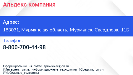 Альдекс, компания по адресу 183031, Мурманская область, Мурманск, Свердлова, 11Б в дальнейшем Организация, размещена в следующих категориях: