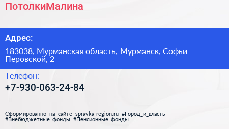 ПотолкиМалина по адресу 183038, Мурманская область, Мурманск, Софьи Перовской, 2 в дальнейшем Организация, размещена в следующих категориях: