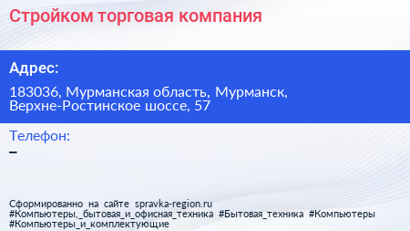 Стройком, торговая компания по адресу 183036, Мурманская область, Мурманск, Верхне-Ростинское шоссе, 57 в дальнейшем Организация, размещена в следующих категориях: