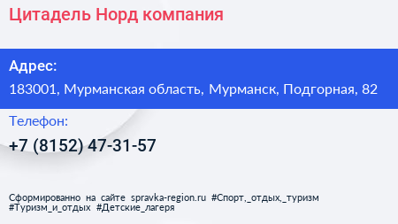 Цитадель Норд, компания по адресу 183001, Мурманская область, Мурманск, Подгорная, 82 в дальнейшем Организация, размещена в следующих категориях: