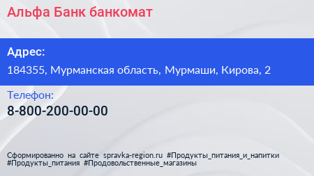 Альфа-Банк, банкомат по адресу 184355, Мурманская область, Мурмаши, Кирова, 2 в дальнейшем Организация, размещена в следующих категориях: