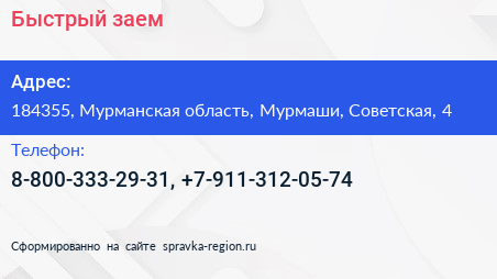Быстрый заем по адресу 184355, Мурманская область, Мурмаши, Советская, 4 в дальнейшем Организация, размещена в следующих категориях: