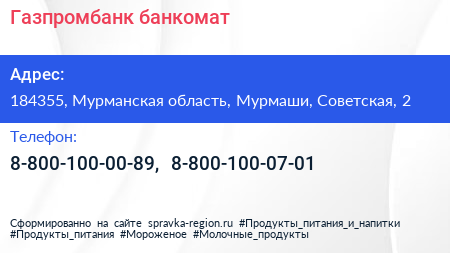 Газпромбанк, банкомат по адресу 184355, Мурманская область, Мурмаши, Советская, 2 в дальнейшем Организация, размещена в следующих категориях: