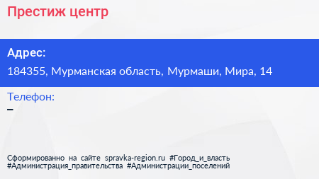 Престиж, центр по адресу 184355, Мурманская область, Мурмаши, Мира, 14 в дальнейшем Организация, размещена в следующих категориях: